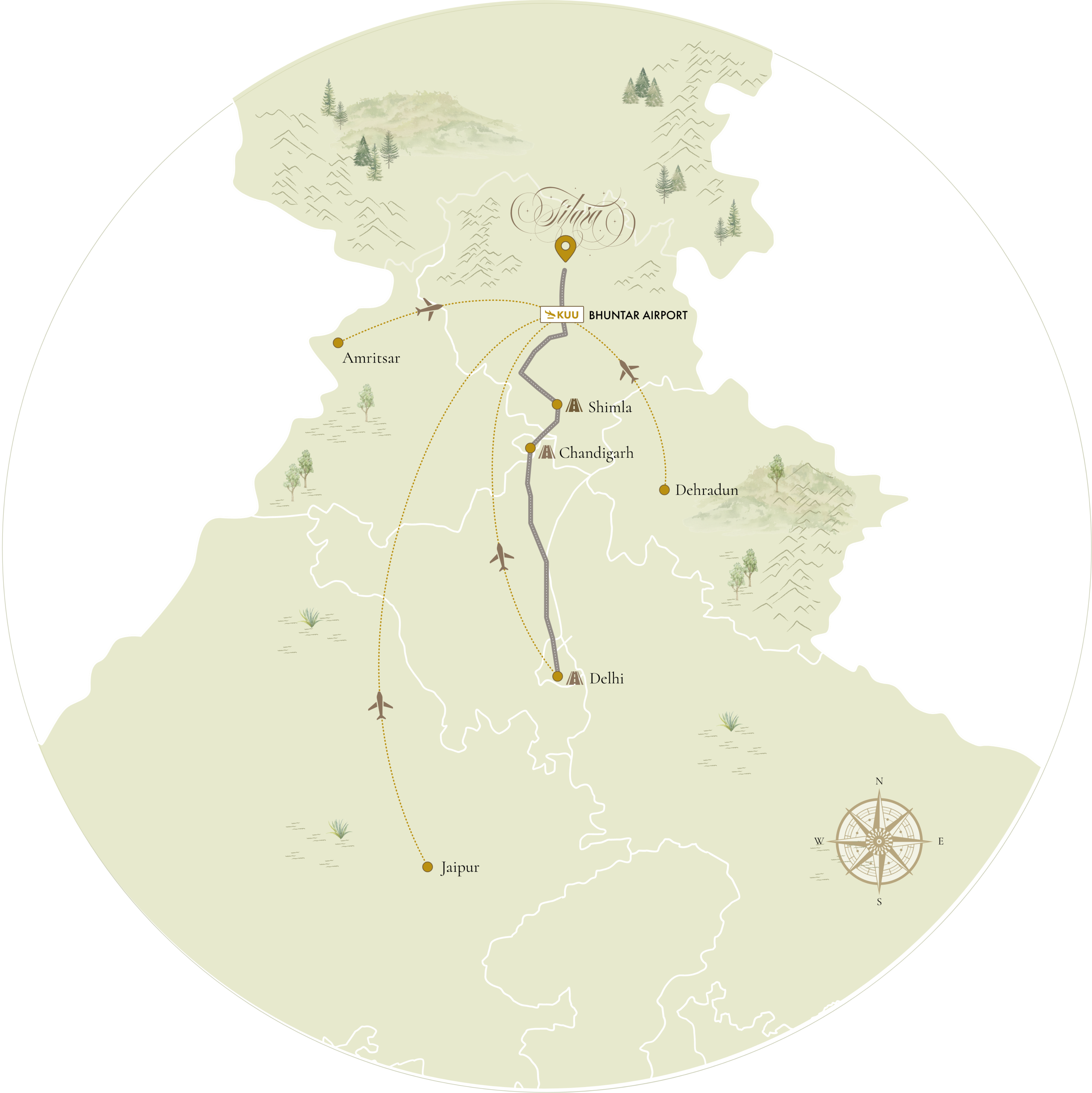 Fly into Bhuntar Airport (KUU), Kullu, the closest airport to Sitara. From Bhuntar, the property is approximately a 90-minute scenic drive away.